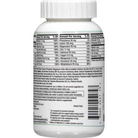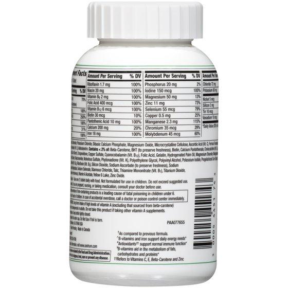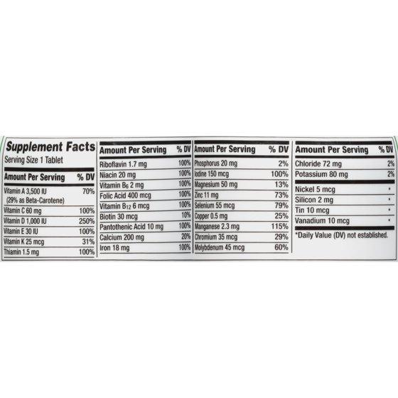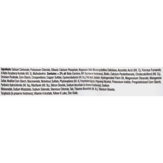 Calcium Carbonate, Potassium Chloride, Dibasic Calcium Phosphate, Magnesium Oxide, Microcrystalline Cellulose, Ascorbic Acid (Vit. C), Ferrous Fumarate, Pregelatinized Corn Starch, DL-Alpha Tocopheryl Acetate (Vit. E). Contains <2% Of: Acacia, Beta-Carotene, BHT, Biotin, Boric Acid, Calcium Pantothenate, Calcium Stearate, Cholecalciferol (Vit. D3), Chromium Picolinate, Citric Acid, Corn Starch, Crospovidone, Cupric Sulfate, Cyanocobalamin, (Vit. B12), FD&C Yellow No. 6 Aluminum Lake, Folic Acid, Gelatin, Hydrogenated Palm Oil, Hypromellose, Manganese Sulfate, Medium-Chain Triglycerides, Modified Food Starch, Niacinamide, Nickelous Sulfate, Phytonadione (Vit. K), Polyethylene Glycol, Polyvinyl Alcohol, Potassium Iodide, Pyridoxine Hydrochloride (Vit. B6), Riboflavin (Vit. B2), Silicon Dioxide, Sodium Ascorbate, Sodium Benzoate, Sodium Citrate, Sodium Metavanadate, Sodium Molybdate, Sodium Selenate, Sorbic Acid, Stannous Chloride, Sucrose, Talc, Thiamine Mononitrate (Vit. B1), Titanium Dioxide, Tocopherols, Tribasic Calcium Phosphate, Vitamin A Acetate (Vit. A), Zinc Oxide. May Also Contain <2% Of: Ascorbyl Palmitate, Maltodextrin, Sodium Aluminosilicate, Sunflower Oil.