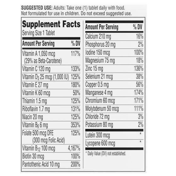 Calcium Carbonate Potassium Chloride Magnesium Oxide Ascorbic Acid (Vit. C) Microcrystalline Cellulose Dibasic Calcium Phosphate DL-Alpha Tocopheryl Acetate (Vit. E) Modified Corn Starch Maltodextrin Corn Starch Crospovidone Contains <2% of: Beta-Carotene, BHT (to preserve freshness), Biotin, Blue 2 Lake, Calcium Pantothenate, Cholecalciferol (Vit. D3), Chromium Picolinate, Copper Sulfate, Cyanocobalamin (Vit. B12), Folic Acid, Gelatin, Hypromellose, Lutein, Lycopene, Magnesium Stearate, Manganese Sulfate, Medium-Chain Triglycerides, Niacinamide, Phytonadione (Vit. K), Polydextrose, Potassium Iodide, Pyridoxine Hydrochloride (Vit. B6), Red 40 Lake, Riboflavin (Vit. B2), Silicon Dioxide, Sodium Ascorbate (to preserve freshness), Sodium Molybdate, Sodium Selenate, Talc, Thiamine Mononitrate (Vit. B1), Titanium Dioxide, Tocopherols (to preserve freshness), Vitamin A Acetate, Yellow 6 Lake, Zinc Oxide