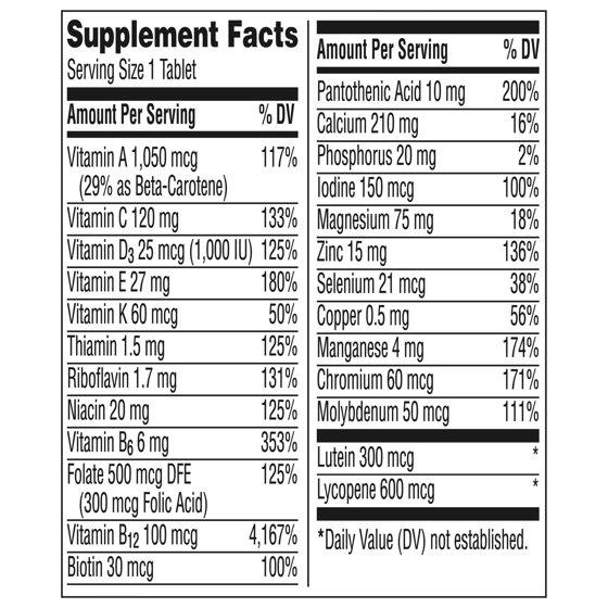 Calcium Carbonate Potassium Chloride Magnesium Oxide Ascorbic Acid (Vit. C) Microcrystalline Cellulose Dibasic Calcium Phosphate DL-Alpha Tocopheryl Acetate (Vit. E) Modified Corn Starch Maltodextrin Corn Starch Crospovidone Contains <2% of: Beta-Carotene, BHT (to preserve freshness), Biotin, Blue 2 Lake, Calcium Pantothenate, Cholecalciferol (Vit. D3), Chromium Picolinate, Copper Sulfate, Cyanocobalamin (Vit. B12), Folic Acid, Gelatin, Hypromellose, Lutein, Lycopene, Magnesium Stearate, Manganese Sulfate, Medium-Chain Triglycerides, Niacinamide, Phytonadione (Vit. K), Polydextrose, Potassium Iodide, Pyridoxine Hydrochloride (Vit. B6), Red 40 Lake, Riboflavin (Vit. B2), Silicon Dioxide, Sodium Ascorbate (to preserve freshness), Sodium Molybdate, Sodium Selenate, Talc, Thiamine Mononitrate (Vit. B1), Titanium Dioxide, Tocopherols (to preserve freshness), Vitamin A Acetate, Yellow 6 Lake, Zinc Oxide