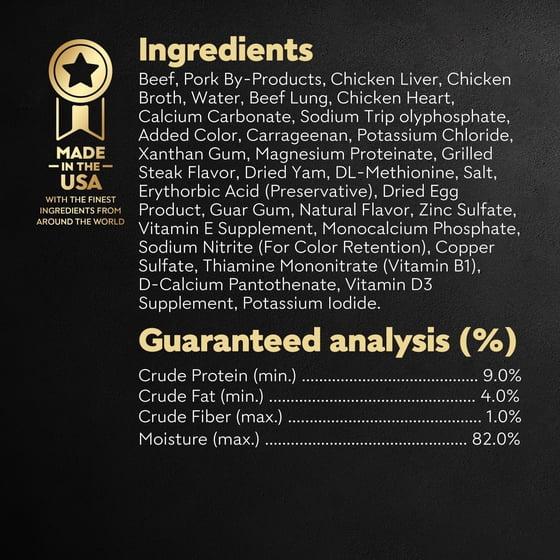 Beef, Pork By-Products, Chicken Liver, Chicken Broth, Water, Beef Lung, Chicken Heart, Calcium Carbonate, Sodium Tripolyphosphate, Added Color, Carrageenan, Potassium Chloride, Xanthan Gum, Magnesium Proteinate, Grilled Steak Flavor, Dried Yam, DL-Methionine, Salt, Erythorbic Acid (Preservative), Dried Egg Product, Guar Gum, Natural Flavor, Zinc Sulfate, Vitamin E Supplement, Monocalcium Phosphate, Sodium Nitrite (For Color Retention), Copper Sulfate, Thiamine Mononitrate (Vitamin B1), D-Calcium Pantothenate, Vitamin D3 Supplement, Potassium Iodide