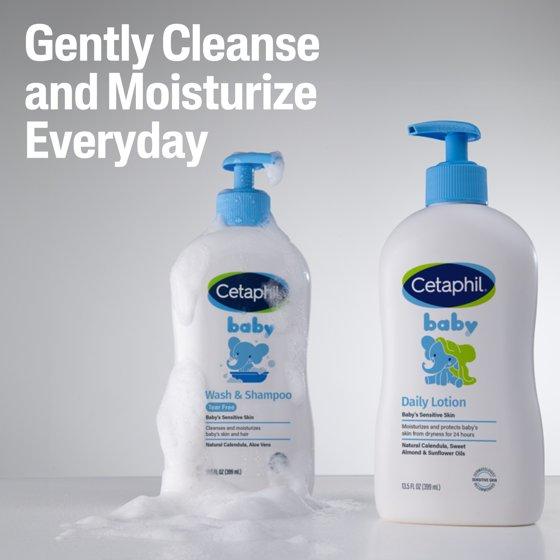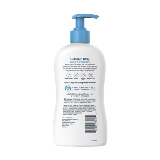 - Cetaphil Baby Moisturizing Aloevera Body Wash and Shampoo, Organic Calendula,, 13.5 fl oz CETAPHIL BABY WASH & SHAMPOO: This tear free 2-in-1 formula blends into a rich lather to gently cleanse your baby's delicate skin and hair, leaving it soft and clean