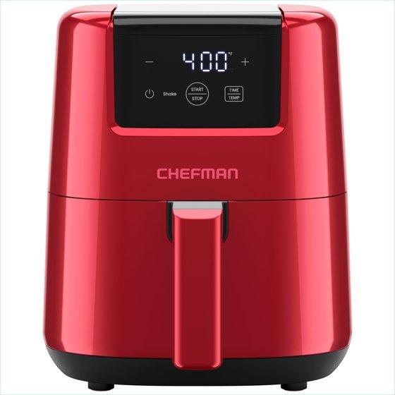 Healthy, fast cooking is within reach with the Chefman TurboFry® Touch 2-Qt Air Fryer. Air fry quickly using little-to-no oil and cook up to three times faster than an oven. Revitalize any limp leftovers, create perfectly crisp French fries, and cook crunchy chicken tenders with a fraction of the calories. The touchscreen user interface lets you easily select cooking time and temperature, and the 2-quart capacity is perfect for cooking meals for 1-2 people. Shake notifications remind you to flip or stir your food for evenly cooked results. The nonstick basket and rack are both top-rack dishwasher safe to make cleanup easy, and the compact frame easily fits in kitchen cabinets and drawers. For added safety, the TurboFry® air fryer shuts off automatically when the basket is removed, or the timer runs out. Purchase includes a 1-year assurance from Chefman. 900W/120V - RJ38-2T-RED NEW