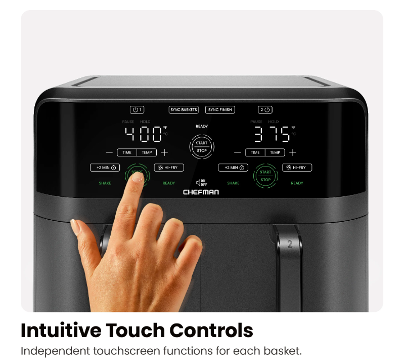 Make healthy meals in minutes with the Chefman Turbofry Touch 6-Quart Dual Air Fryer. Cook multiple foods in this 2-basket air fryer using less oil and faster than a traditional oven! The dual 3-quart air fryer baskets can cook a main and side dish simultaneously, and both finish together using the Sync Finish option. With air fryer cooking temperatures from 200-450°F, you can cook low and slow or get the crispiness you crave with the Hi-Fry feature. Ensure evenly cooked foods with the Shake Reminder or quickly add 2 minutes of cooking with the +2 minutes button. Purchase includes a 1-year assurance from Chefman. 1700 Watts / 110 Volts - RJ38-SQPF-3TDB-2-AM