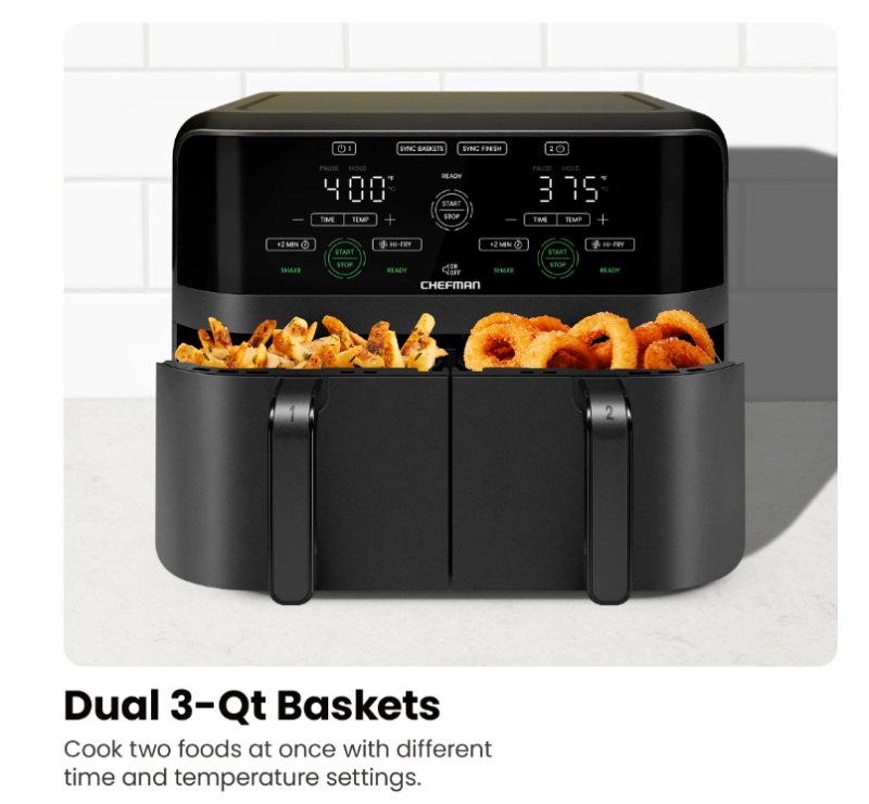 Chefman Dual Basket Air Fryer w/ Digital Touchscreen, 2 Independent 3 Qt Baskets, Sync Finish - Black