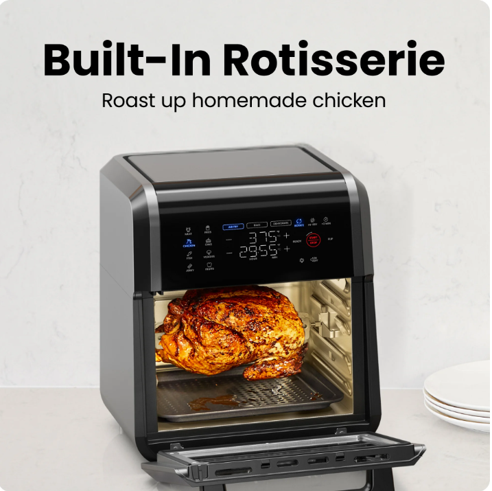 - ROTISSERIE CHICKEN COOKER : The stainless-steel rotisserie oven spit ensures crispy air-fried skin with a fraction of the added fat.