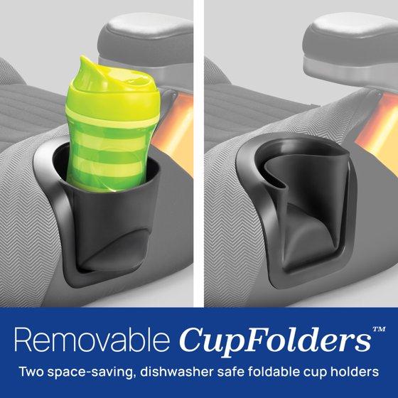 Two soft-sided CupFolders™ easily flex and fold out of the way to save space. For parent convenience, the cup holders are easy to remove and dishwasher-safe. All fabrics are also removable and machine-washable, including the pop-out arm rest covers.