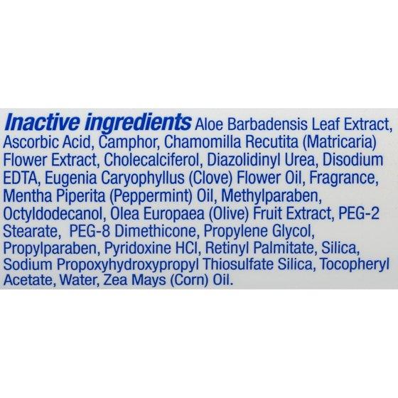 Active Ingredients: Benzocaine 10%. Inactive Ingredients: Aloe barbadensis leaf juice, ascorbic acid, camphor, chamomilla recutita (matricaria) flower extract, cholecalciferol, diazolidinyl urea, disodium EDTA, eugenia caryophyllus (clove) flower oil, fragrance, mentha piperita (peppermint) oil, methylparaben, octyldodecanol, olea europaea (olive) fruit extract, PEG-2 stearate, PEG-2 stearate SE, PEG-2 dimethicone, propylene glycol, propylparaben, pyridoxine Hcl, retinyl palmitate, sodium propoxyhydroxypropyl thiosulfate silica, tocopheryl acetate, water, zea mays (corn) oil