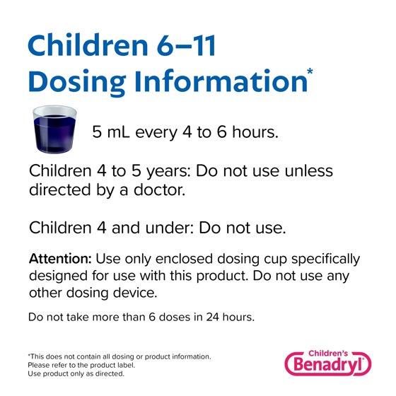 - Intended for ages 6 to 11, Benadryl children's allergy liquid is both alcohol-free and sugar-free