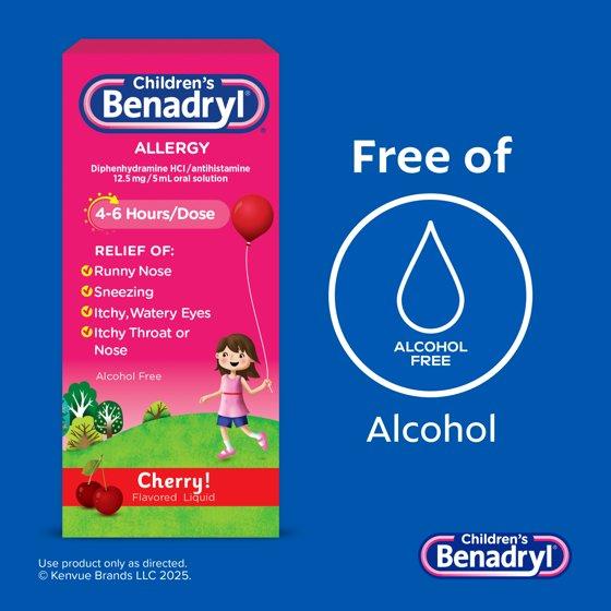 - Intended for ages 6 to 11, Benadryl children's allergy relief liquid is alcohol-free