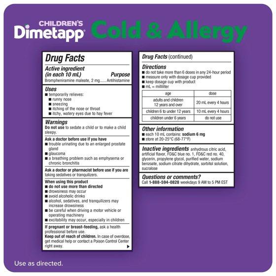- FAST-ACTING, PROVEN RELIEF: The sick day struggle is real but it doesn’t have to be. Children's Dimetapp Cold & Allergy delivers soothing relief from stubborn cold & allergy symptoms quickly so your child can start feeling better, faster