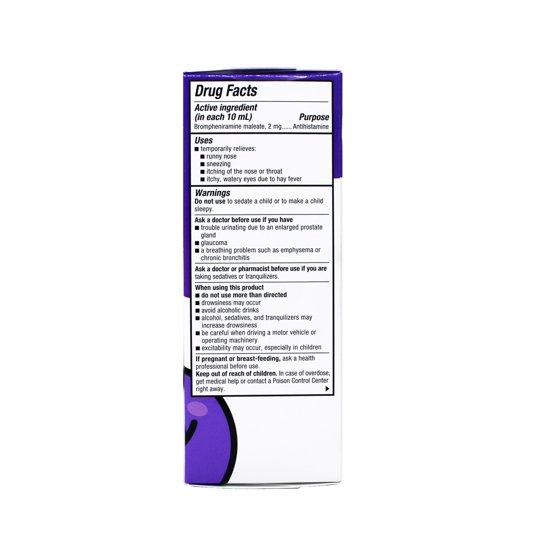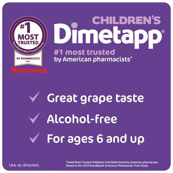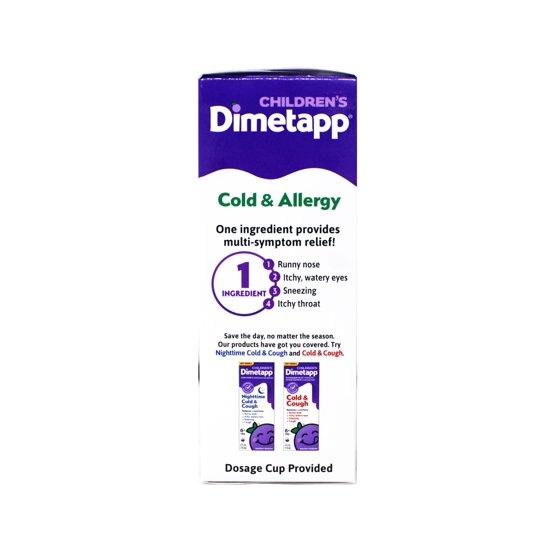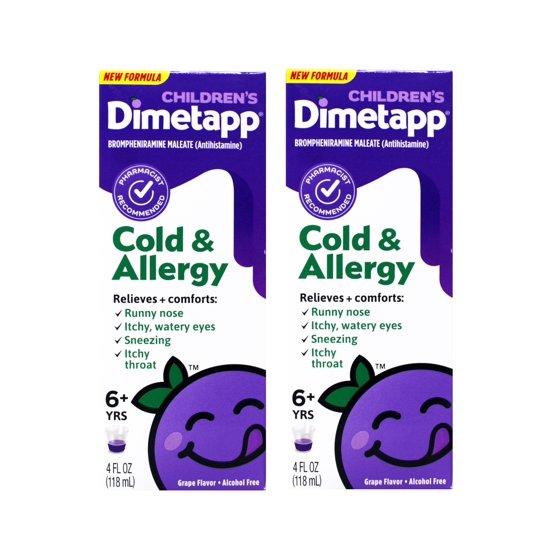 Children’s Dimetapp is phenylephrine-free and formulated to tackle the ickiest cold and allergy symptoms: itchy, watery eyes, itchy throat, runny nose, and sneezing. It's a safe and effective solution for kids, specially formulated to provide relief from cold and allergy symptoms. The active ingredient in Children's Dimetapp Cold & Allergy is Brompheniramine Maleate, an antihistamine that is both safe and effective for children ages 6 years and older. Explore our full range of cold, cough and allergy medicines for kids, including the new Dimetapp Cough & Allergy Chewable Tablets, and our liquid formulas Dimetapp Cold & Allergy, Dimetapp Cold & Cough, and Dimetapp Multi-Symptom Cold & Flu. Choose the children's cold medicine that best suits your child's symptoms. For over 50 years, parents have trusted Dimetapp to help their kids feel better, faster. Use as directed. Children’s Dimetapp Cold & Allergy Medicine, Antihistamine, Relieves Runny Nose, Sneezing, Itchy, Watery Eyes & Itchy Throat, Grape Flavor, Alcohol-Free, Phenylephrine-Free, 4 fl oz EFFECTIVE COLD & ALLERGY RELIEF: Children’s Dimetapp Cold & Allergy liquid works quickly to help relieve multiple bothersome cold and allergy symptoms like sneezing, runny nose, itchy throat, and itchy, watery eyes - in a single dose! FAST-ACTING, PROVEN RELIEF: The sick day struggle is real but it doesn’t have to be. Children's Dimetapp Cold & Allergy delivers soothing relief from stubborn cold & allergy symptoms KID-FRIENDLY FORMULA: Children’s Dimetapp kid-friendly formula is designed to target specific cold & allergy symptoms so your child gets the medicine they need and nothing they don’t to help them feel better, fast SAFE AND EFFECTIVE FOR KIDS: Formulated for children 6 years of age and older, Children’s Dimetapp works to help alleviate children's cold & allergy symptoms so they can start feeling better, faster