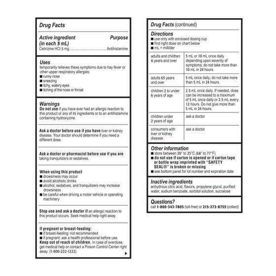 In Each 5 mL Active Ingredients: Cetirizine HCI (5 mg), Antihistamine. Inactive Ingredients: Anhydrous Citric Acid, Flavors, Propylene Glycol, Purified Water, Sodium Benzoate, Sorbitol Solution, Sucralose.