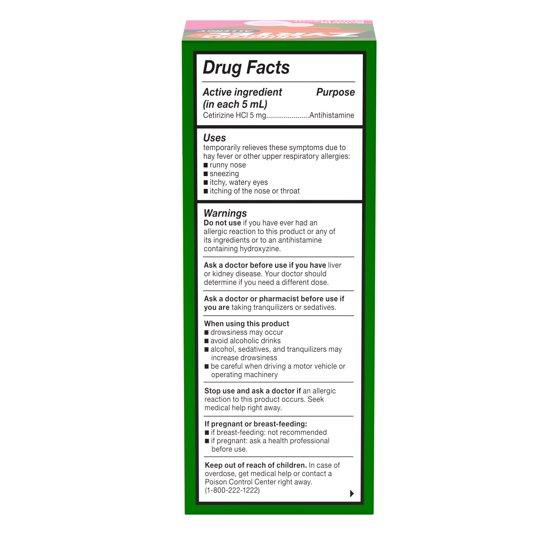 - Allergy syrup gives powerful relief with 5 mg of antihistamine cetirizine hydrochloride per 5 mL
