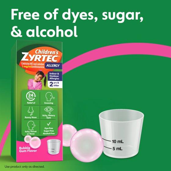 - Available in bubble gum flavor, children's allergy relief medicine is dye-, alcohol-, & sugar-free