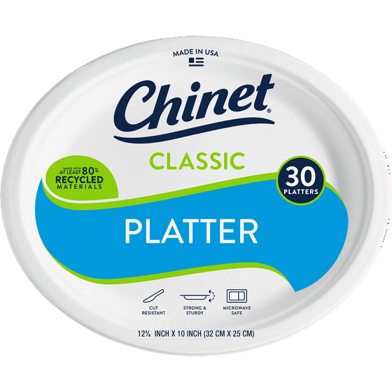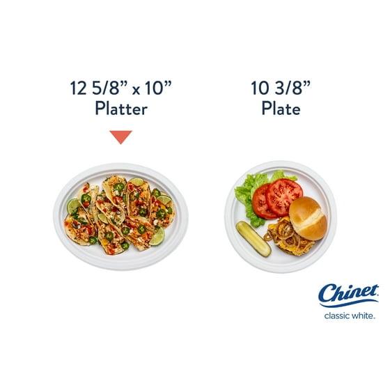 Say goodbye to overstuffing small paper plates and put Chinet Classic® Paper Platters at the top of your party supplies list! Celebrate with party plates that are durable enough to get seconds. With a functional design complemented by premium strength and durability, Chinet Classic® white paper dinner platter is your choice for holidays and big family gatherings. Steaks, sides, and messy sauces that usually leak through average white paper plates are no match for Chinet. Our 12 ⅝ x 10" oval heavy-duty paper platters are leak-resistant and cut-resistant. Clean-up is easy and earth-friendly because our paper plates are made from at least 80% recycled material. That means more time enjoying what brought you together and less time cleaning up. Recommended for residential and commercial use. For a fully coordinated look, pair Chinet large paper plates with Chinet appetizer plates and plasticware.