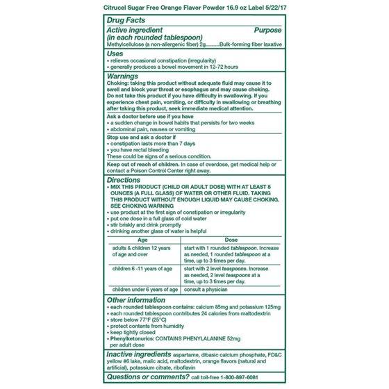 Citrucel Sugar Free Fiber Powder for Occasional Constipation Relief is a clinically proven fiber therapy that gently (2) helps relieve occasional constipation, without any sugar. This great tasting orange flavored fiber powder gives you 100 percent soluble, non-fermentable fiber to help treat occasional constipation without causing unwanted excess gas (1). Citrucel sugar free fiber powder can take anywhere between 12 to 72 hours to produce results, so it's best to start using this methylcellulose fiber at the first sign of constipation or irregularity. Each rounded tablespoon of this sugar free fiber drink mix contains 2 grams methylcellulose, 80 mg calcium and 115 mg potassium. Adults and children 12 years of age and older may take 1 tablespoon at a time of this fiber powder, up to three times daily, and children ages 6 to 11 years may take 2 level teaspoons up to three times daily. Simply add the appropriate dose of this water soluble fiber powder to at least 8 ounces of water or juice, stir briskly and drink promptly. Trust Citrucel to provide fiber for irregularity that won't cause excess gas (1).