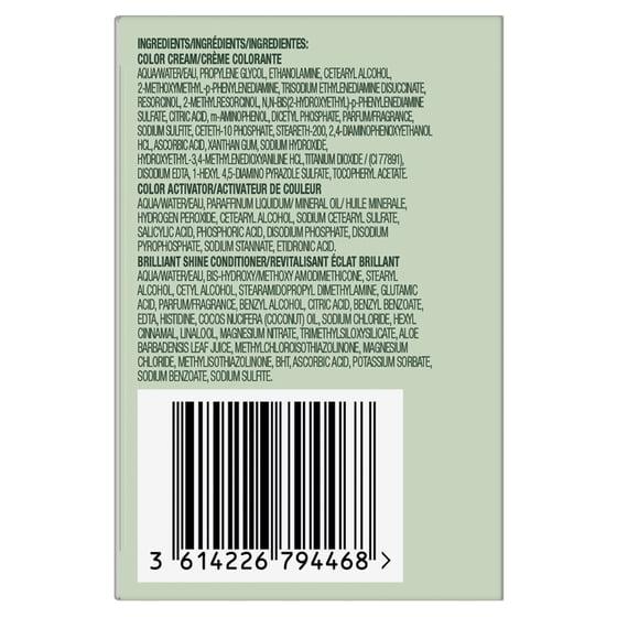 Color Enhancing Creme:Aqua/Water/Eau, Propylene Glycol, EthaNlamine, Cetearyl Alcohol, 2-Methoxymethyl P-Phenylenediamine, Trisodium Ethylenediamine Disuccinate, ResorciNl, 2 MethylresorciNl, N,N-Bis(2-Hydroxyethyl)- P-Phenylenediamine Sulfate, Citric Acid, M-AmiNpheNl, Dicetyl Phosphate. Parfum/Fragrance, Sodium Sulfite, Ceteth-10 Phosphate, Steareth-200. 2,4-DiamiNpheNl Hcl, Ascorbic Acid, Xanthan Gum, Sodium Hydroxide, Hydroxyethyl-3, 4-Methylenedianiline Hcl, Titanium Dioxide / (Ci 77891), Disodium Edta, 1 -Hexyl 4, 5-DiamiN Pyrazole Sulfate, Tocopheryl Acetate.Color Activator:Aqua/Water/Eau, Paraffinum Liquidum / Mineral Oil, Hydrogen Peroxide, Cetearyl Alcohol, Sodium Cetearyl Sulfate, Salicylic Acid, Phosphoric Acid, Disodium Phosphate. Disodium Pyrophosphate, Sodium Stannate, Etidronic Acid.Brilliant Shine Conditioner:Aqua/Water/Eau, Bis-Hydroxy/Methoxy Amodimethicone, Stearyl Alcohol, Cetyl Alcohol, Stearamidopropyl Dimethylamine, Glutamic Acid, Parfum/Fragrance, Benzyl Alcohol, Citric Acid, Benzyl Benzoate, Edta, Histidine, Cocos Nucifera (Coconut) Oil, Sodium Chloride, Hexyl Cinnamal, Linalool, Magnesium Nitrate, Trimethylsiloxysilicate, Aloe Barbadensis Leaf Juice, MethylchloroisothiazoliNne, Magnesium Chloride, MethylisothiazoliNne, Bht, Ascorbic Acid, Potassium Sorbate, Sodium Benzoate, Sodium Sulfite.