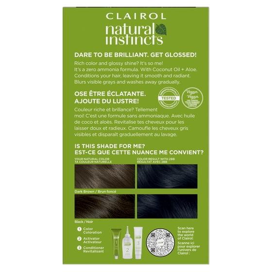 Clairol Natural Instincts Demi-Permanent Hair Color Creme, 2BB Blue Black, 1 Application, Hair Dye. Discover your natural way to shine! Clairol Natural Instincts gives you a rush of radiant, natural-looking color you can feel good about. Say "yes" to gentle ingredients like coconut oil and aloe vera and say "no" to ammonia and added parabens. Our no-drip crème formula is designed to feel more like a conditioner, and it's gentle on all hair types and textures. Treat yourself to color that blends away grays, boosts shine, and lasts up to 28 washes. Available in 37 natural shades, so you can find the black, brunette, blonde, or red hue that's totally you.