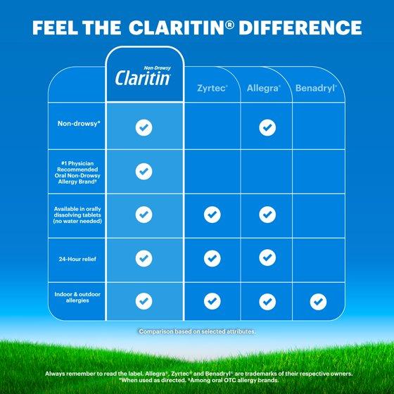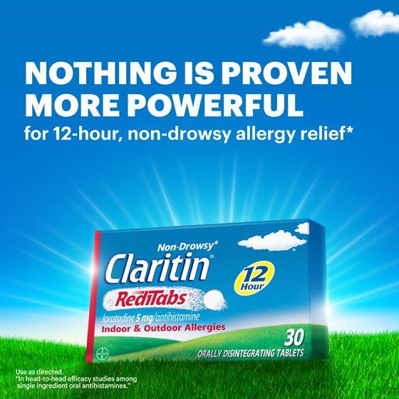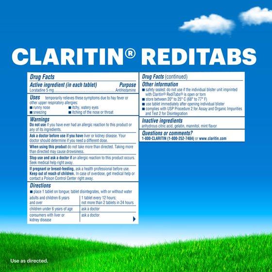Claritin RediTabs provide powerful, 24-hour, non-drowsy relief of your worst indoor and outdoor allergy symptoms, including sneezing, runny nose, itchy/watery eyes and itchy throat/nose. Claritin provides relief of symptoms that can be triggered by over 200 different allergens. Claritin is an antihistamine, so it hinders the cascade triggered by allergens. Easy-to-take because the orally dissolvable tablet melts in mouth and requires no water. For adults and children ages 6+. One tablet contains 10 mg of loratadine.