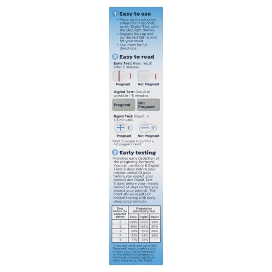 - TRIPLE ASSURANCE PREGNANCY TEST KIT: Includes one (1) Early Detection Pregnancy Test, one (1) Early Digital Pregnancy Test, and one (1) Rapid Detection Pregnancy Test