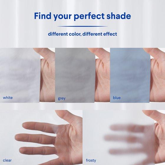 - FEEL REFRESHED IN YOUR BATHROOM: These shower liners are available in a white, blue, clear, gray, and frosty finish. The blue design coordinates with any bathroom decor while providing more privacy.