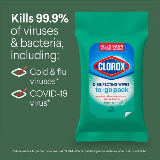 - DISINFECTING WIPES: Clorox Disinfecting Wipes kill 99.9% of germs, including pseudomonas aeruginosa, salmonella enterica and staphylococcus aureus when used as directed, on hard, nonporous surfaces