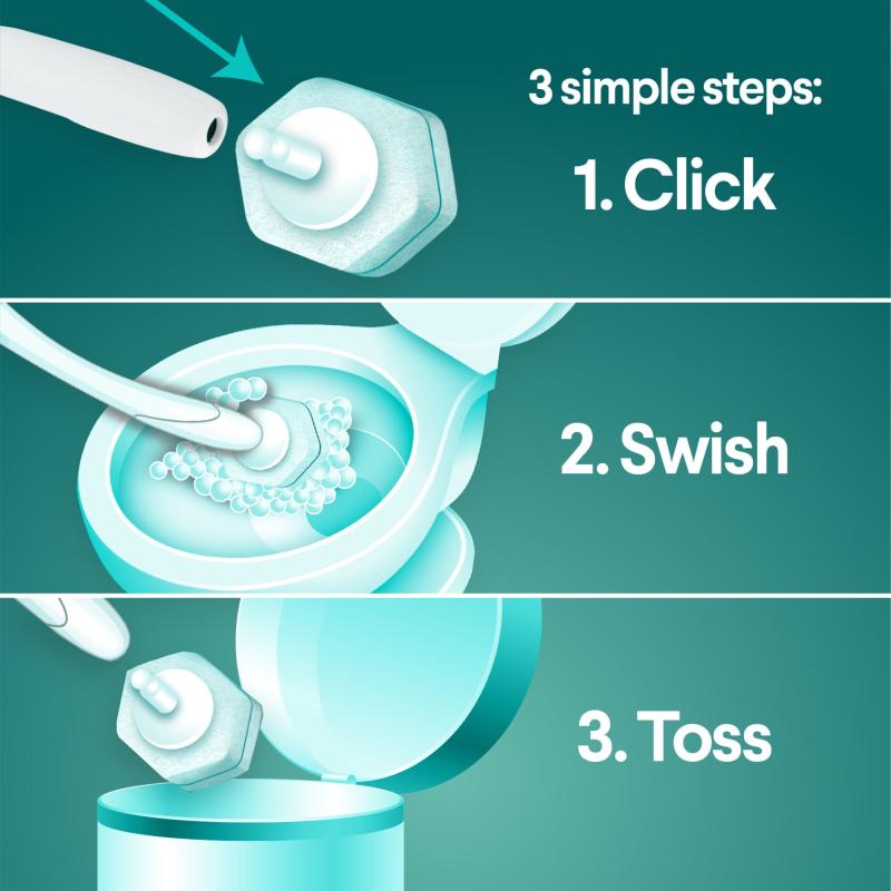 To Clean: Open pouch of disposable cleaning heads and push handle straight down onto cleaning head unit until it clicks into place. Empty bowl before cleaning. Dip cleaning head in toilet bowl water for 1 to 2 seconds. Scrub entire toilet bowl above water line. When finished, release excess water by pressing cleaning head against toilet bowl and slide blue button forward to release head into trash bin. Flush to rinse toilet. Do not flush cleaning head.