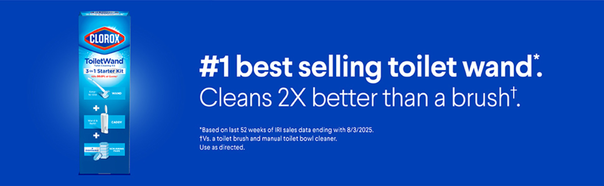 Clorox ToiletWand is an easy to use, all in one system that makes the dreaded toilet cleaning experience a breeze. The all in one system contains: 1 wand with a long handle to help you clean from a distance, 6 disposable scrubbing pads preloaded with cleaner and 1 caddy to conveniently store scrubbing pad refills. Each disposable scrubbing pad is preloaded with Clorox Cleaner that kills 99.9% of germs*. Scrubbing pads power through hard water and lime stains 2X faster than when using a toilet brush with manual toilet bowl cleaner. Never touch an icky toilet brush again: disposable scrubbing pads conveniently pop off into the trash so you can toss the mess every time. *When used as directed.