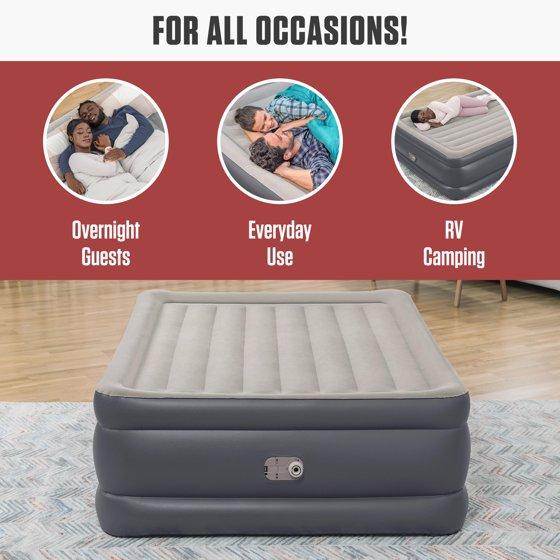 - Queen-sized air mattress with built-in 110-120V AC pump for quick inflation in 5 minutes