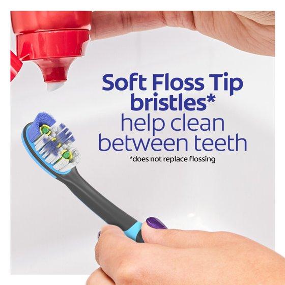 - The soft toothbrush features soft Floss Tip bristles* that help clean between teeth (*does not replace flossing)