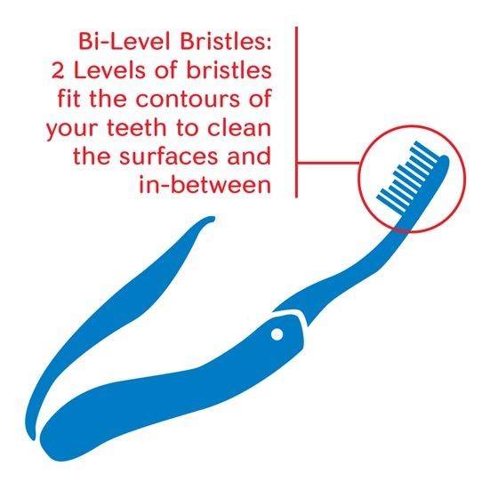 - Has two levels of bristles that fit the contours of your teeth to clean the surface and in between