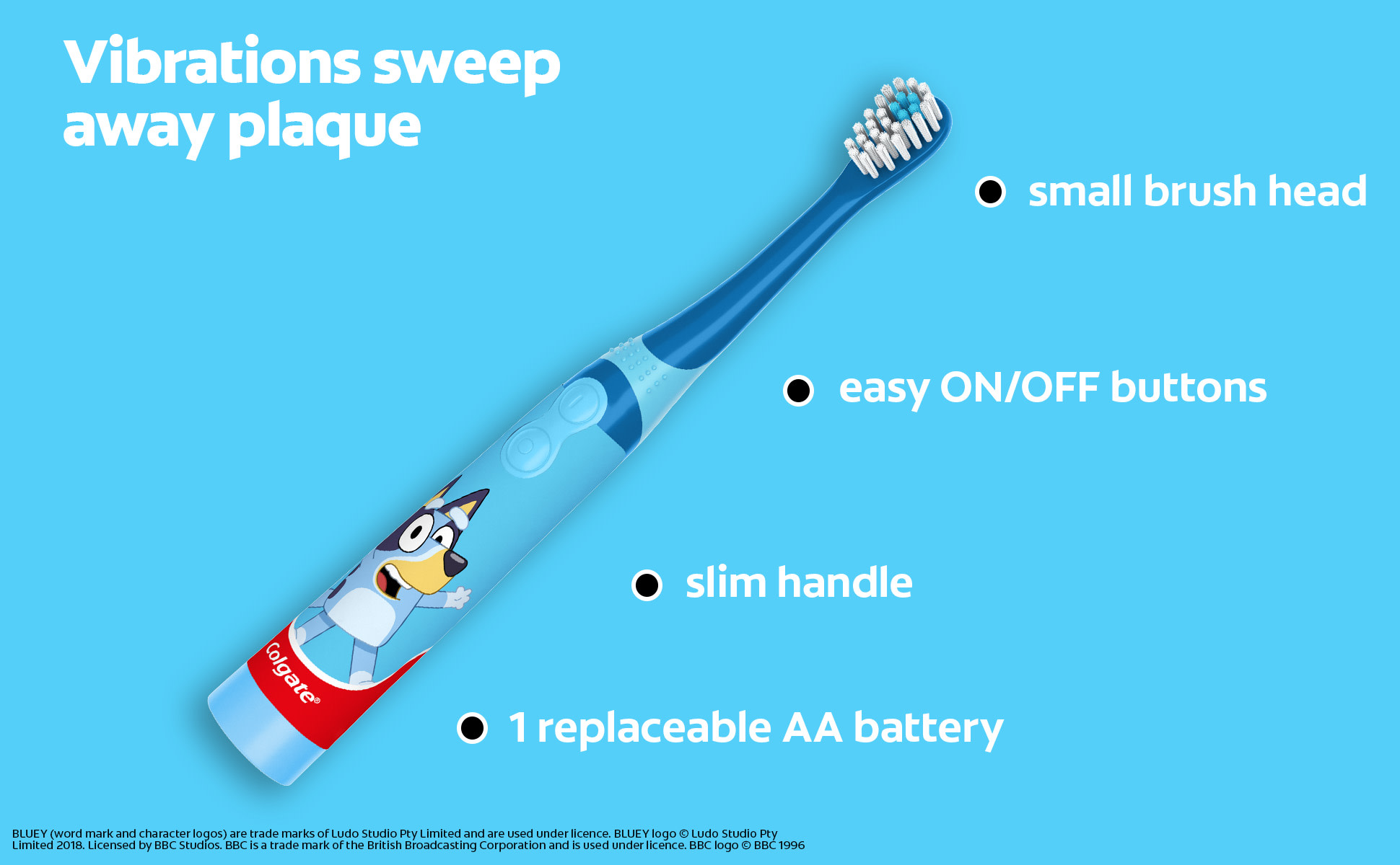 - Includes one (1) Colgate Kids Battery Toothbrush with included AA battery, Bluey Battery Toothbrush for Kids