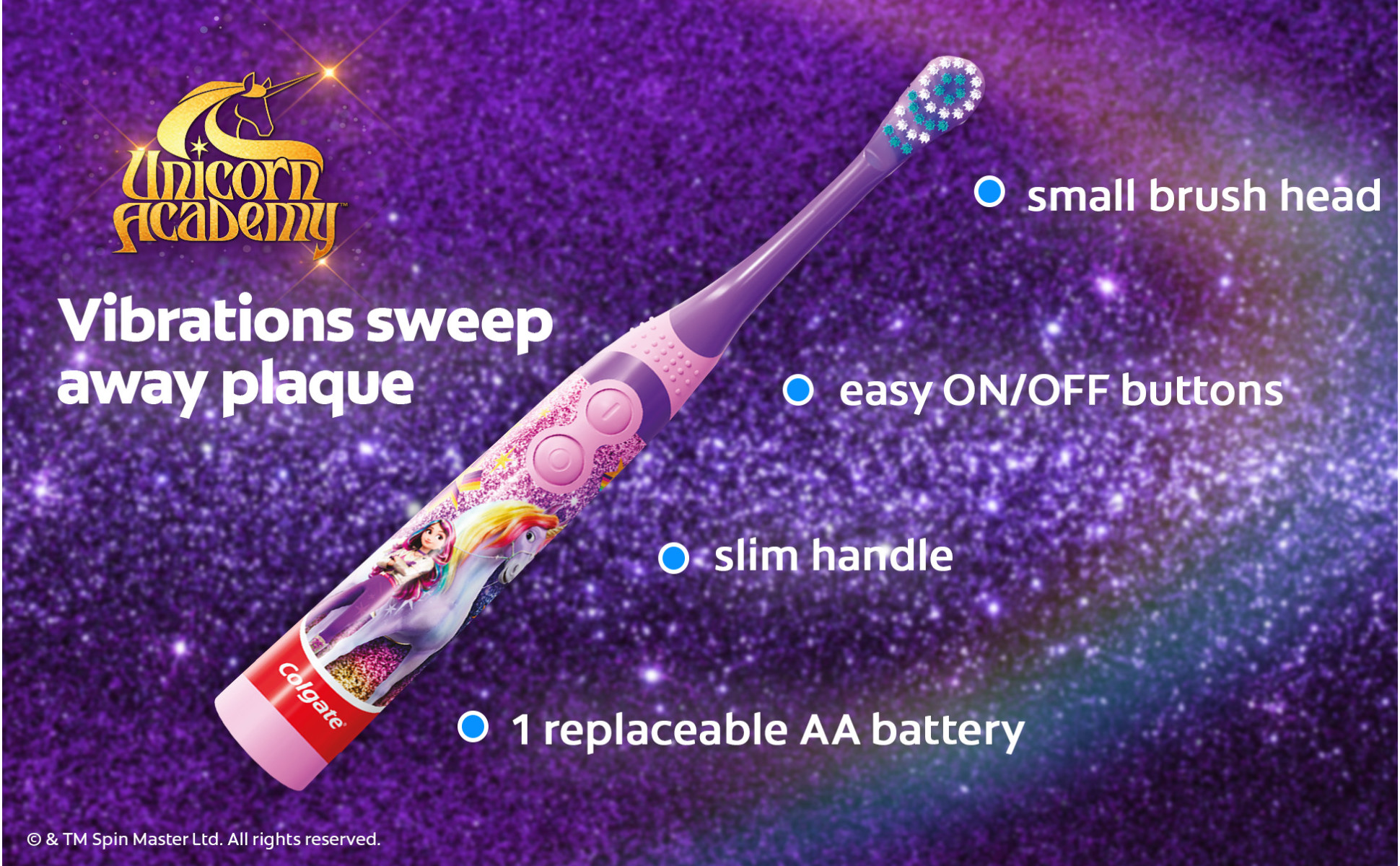 - Includes one (1) Colgate Kids Battery Powered Unicorn Toothbrush with included AA battery