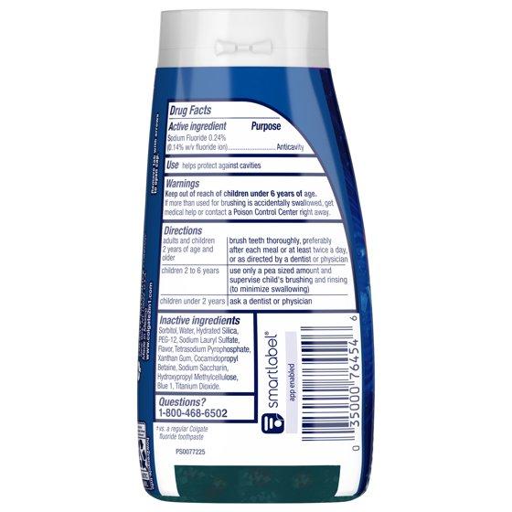 Active Ingredients: Sodium Fluoride (0.14% w/v Fluoride Ion) (0.24 %), Anticavity. Inactive Ingredients: Sorbitol, Water, Hydrated Silica, PEG-12, Sodium Lauryl Sulfate, Flavor, Tetrasodium Pyrophosphate, Xanthan Gum, Cocamidopropyl Betaine, Sodium Saccharin, Hydroxypropyl Methylcellulose, Blue 1, Titanium Dioxide.