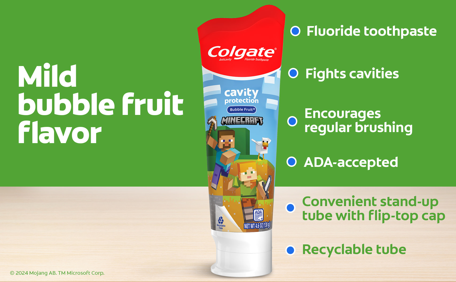 - Includes one (1) 4.6 oz tube of Colgate Minecraft Kids Toothpaste with Fluoride in an exciting Mild Bubble Fruit bubblegum toothpaste flavor