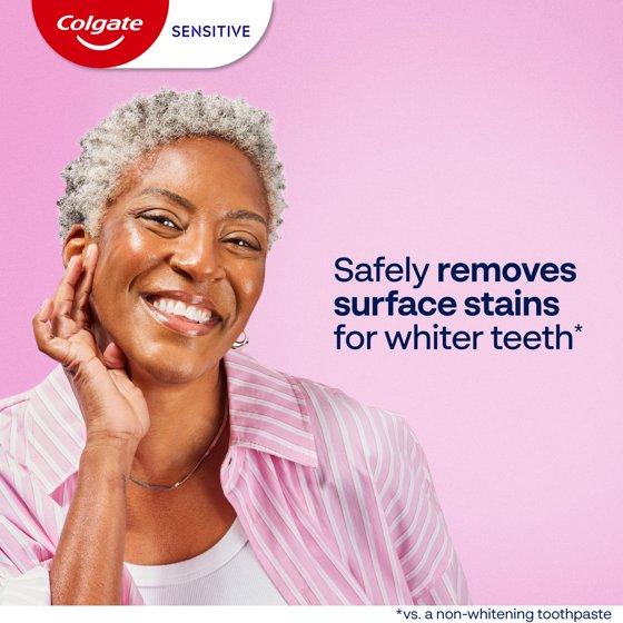 - Colgate Sensitive Whitening Toothpaste Gel safely removes surface stains for whiter teeth vs. a non-whitening toothpaste