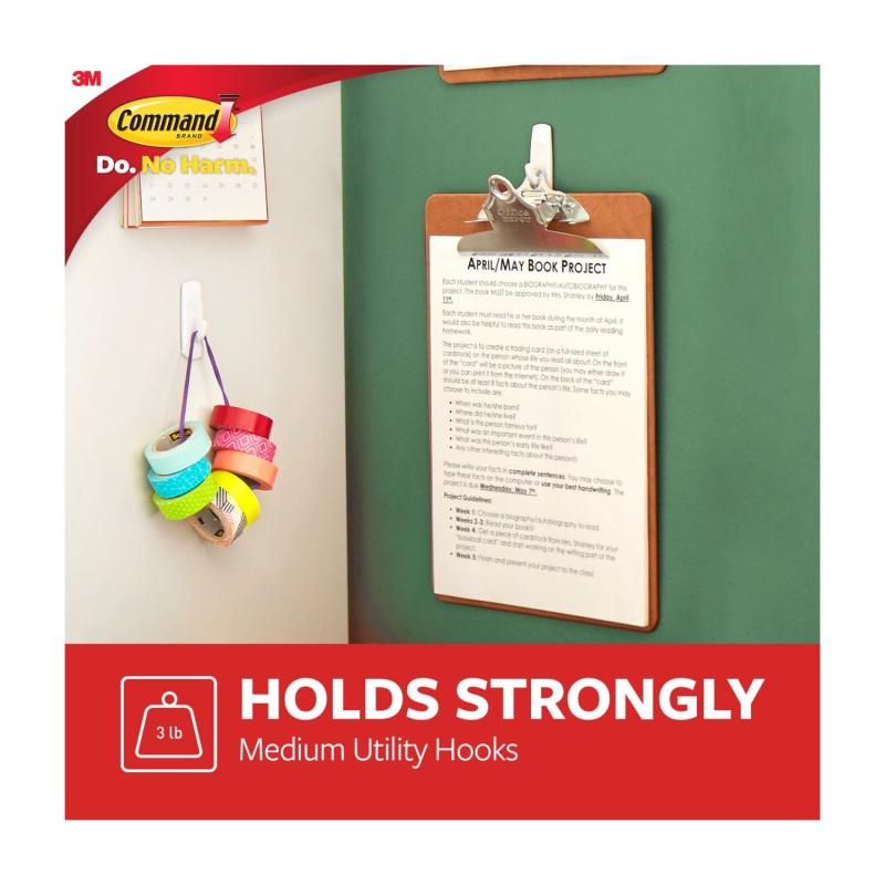 - HOLDS UP TO 3 POUNDS: One package of the Command Medium Utility Hooks includes two wall hooks and four adhesive strips; each adhesive wall hook can hold up to three pounds