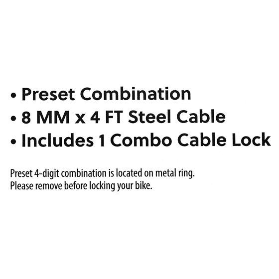 Keep your bike safe and secure with this Concord Combo Cable Bike Lock. It features a four foot by eight-millimeter steel cable that coils up easily to store under a bike seat and includes a four-digit preset combination. To lock your bike properly, wrap the cable around your bicycle frame, front or rear tire, and a fixed object. An independent lab has rated the security of this lock a one on a five-point scale. Check out all the bike accessories from Concord to create a bike that expresses your unique style. You'll have peace of mind when you have this Concord Combo Cable Bike Lock.