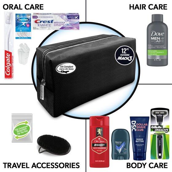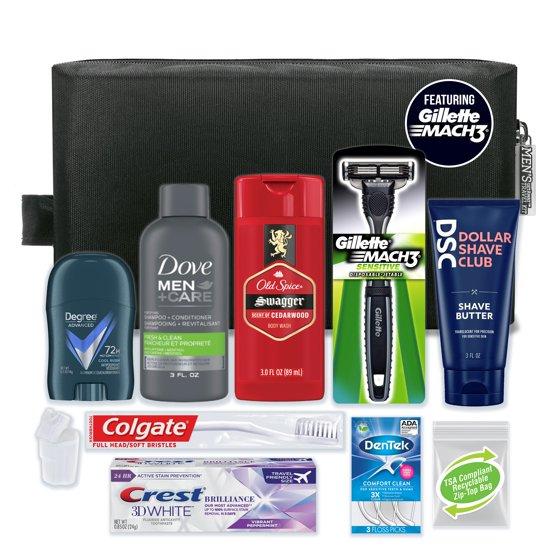 Stay organized and fresh wherever you go with the Men’s Travel Bag from Convenience Kits International — the perfect travel essential for today’s man. This compact kit includes a curated assortment of travel-size men’s hygiene and grooming products neatly packed into a reusable zippered toiletry bag. Designed to be TSA-friendly and ideal for carry-on luggage, this travel bag is great for business trips, weekend getaways, gym sessions, college life, or any time you need reliable personal care on the move. With quality essentials in one convenient kit, it’s the easy way to stay prepared and polished on every trip. Convenience Kits International Men's Travel Bag contains. Dollar Shave Club Shave Butter 3 oz., Dove Men 2in1 Shampoo+Conditioner 3 oz., Old Spice Swagger Body Wash 3 oz., Degree for Men A/P Deodorant .5 oz., Crest Toothpaste .85 oz., Colgate Toothbrush, Toothbrush Cap, Dentek ADA Accepted Flossers 3 ct., Gillette Mach 3 Razor, Palm Scalp Brush, TSA Compliant Quart Size Zip Top Bag in black rectangular travel bag with handle.
