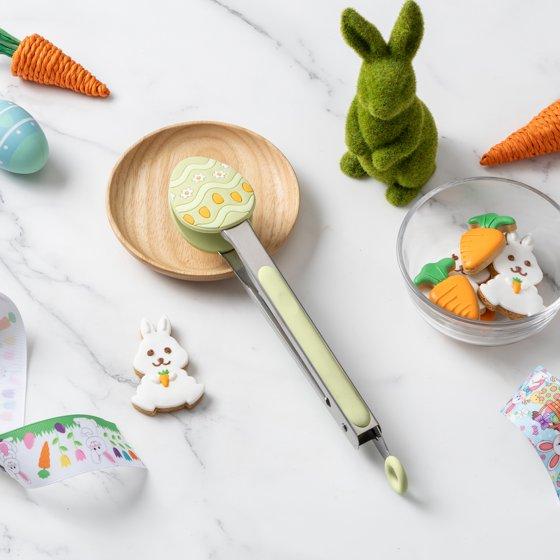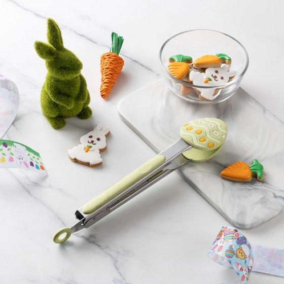 This festive Cook With Color green 9-inch locking tong features a playful silicone head shaped like an Easter egg, bringing a cheerful seasonal touch to your kitchen essentials. The heat-resistant silicone tips are gentle on cookware, including non-stick surfaces, ensuring safe and efficient handling of food while flipping, serving, or tossing. The durable stainless steel handle is wrapped in soft silicone, offering a comfortable, non-slip grip for precise control during use. Equipped with a convenient locking mechanism, this tong folds securely for easy storage and space-saving convenience. Perfect for everyday cooking or adding a bit of Easter charm to your table, this Easter egg-shaped tong combines functionality with festive fun.