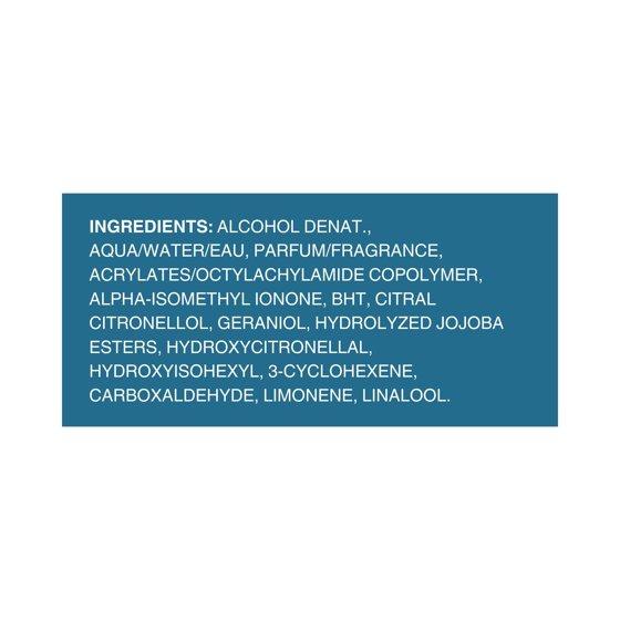 Alcohol Denat, Water, Fragrance, Acrylates/Octylacrylamide Copolymer, Alpha-Isomethyl Ionone, BHT, Citral, Citronellol, Geraniol, Hydrolyzed Jojoba Esters, Hydroxycitronellal, Hydroxyisohexyl 3-Cyclohexene Carboxaldehyde, Limonene, Linalool.