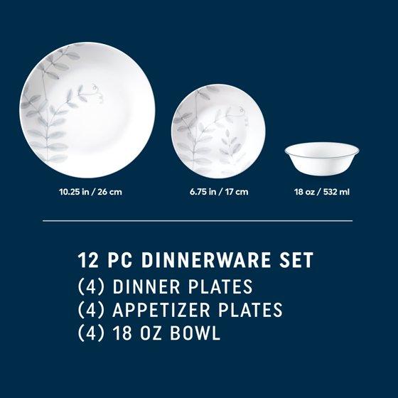 - 12-PIECE DINNERWARE SET: (4) 10.25" dinner plates, (4) 6.75" appetizer plates and (4) 18 oz soup/cereal bowls
