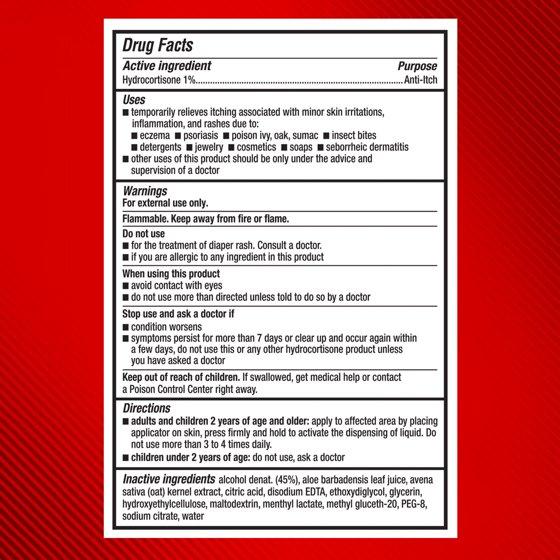 Active Ingredients: Hydrocortisone (1 %). Purpose: Anti-Itch. Inactive Ingredients: Aloe Barbadendsis Leaf Juice, Avena Sativa (Oat) Kernel Extract, Citric Acid, Disodium EDTA, Ethoxydiglycol, Glycerin, Hydroxyethylcellulose, Maltodextrin, Menthyl Lactate, Methyl Gluceth-20, PEG-8, SD Alcohol 40 (45%), Sodium Citrate, Water