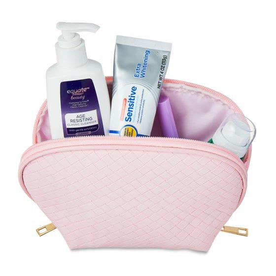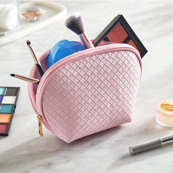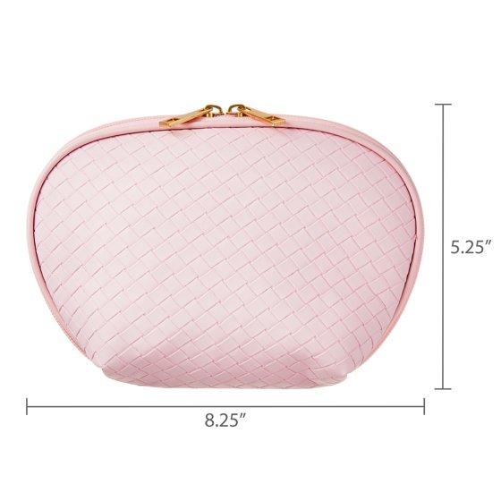 - Cosmetic Accessory Pouch with Double Zipper, Baby Pink Basket Weave