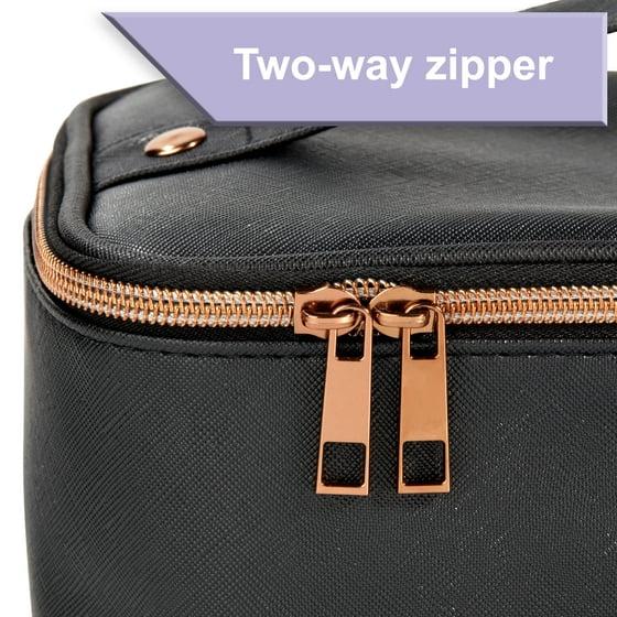 Keep your cosmetics and accessories organized and ready to go at a moment's notice with this Black Cosmetic Train Case. This attractive case is the perfect traveling size and features a single two-way bronze zipper on a wide opening, an elastic strap to keep your brushes secure in the lid, and an easy-carry handle on top. The large, open interior space has enough room to keep all of your cosmetic and accessory items secure and in one place for travel, and the waterproof exterior fabric is durable enough to last. Great for on the go or storage at home, this train case has pockets to keep all of your accessories in one place for easy access. This sophisticated and elegant Black Cosmetic Train Case is the perfect traveling partner.
