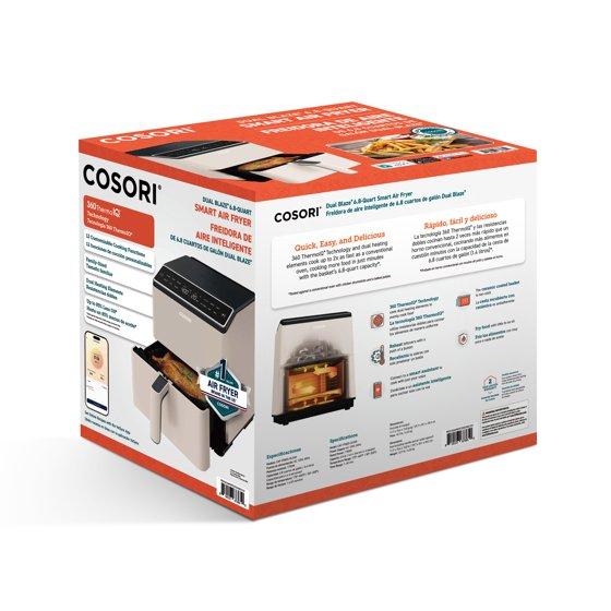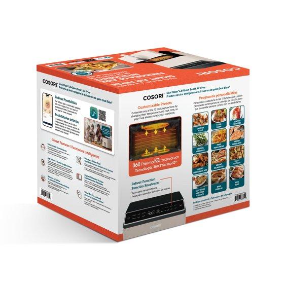 Upgrade your air frying with the COSORI Dual Blaze™ 6.8-Quart Smart Air Fryer. With 360 ThermoIQ™ Technology, it cooks food evenly without preheating or shaking. The LED display has 12 cooking functions for easy use. Connect to the VESYNC app to adjust settings, check your food, find recipes, and use voice control with Amazon Alexa or Google Assistant. Power: 1700 watts.