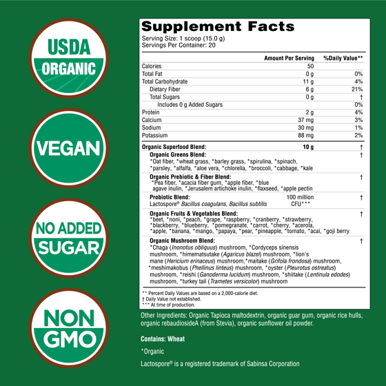 Organic Produce Blend: Organic Greens Blend: Grass Blend (Wheat Grass, Barley Grass, Alfalfa leaf), Oat Fiber, Spirulina, Flax Seed, Spinach, Parsley, Chlorella, Aloe Vera inner leaf gel 200:1 concentrate, Broccoli, Kale, Green Cabbage. Organic Fruits & Vegetables Blend: Beet, Red Raspberry, Cranberry, Strawberry, Blackberry, Blueberry, Pomegranate, Carrot, Cherry, Acerola, Apple, Banana, Flax, Mango, Papaya, Pear, Pineapple, Tomato, Peach, Noni, Acai, Watermelon. Organic Prebiotic & Fiber Blend: Green Pea Fiber, Acacia fibergum, Blue Agave Inulin, Jerusalem Artichoke Inulin, Apple Pectin. Probiotic Blend: Lactospore? Bacillus Coagulans, Bacillus Subtilis (100 million CFU). Organic Mushroom Blend: Maitake Mushroom (Grifola Frondosus), Himematsutake (Agricus Blazei) Mushroom, Cordyceps Sinensis Mushroom, Turkey Tail (Trametes Versicolor) Mushroom, Shitake (Lentinula Edodes) Mushroom Powder, Lion's Mane (Hericium Erinaceaus) Mushroom, Zhu Ling (Plyporous Umbellatus) Mushroom, Chaga (Inonotus Obliquus) Mushroom, Reishi (Ganodema Iucidum) Mushroom, Meshimakobu (Phellinus linteus) Mushroom. Other Ingredients: Organic Tapioca Maltodextrin, Organic Guar Gum, Organic Rebaudioside A (from Stevia), Organic Sunflower oil powder. ?Lactospore is a registered trademark of Sabinsa Corporation.