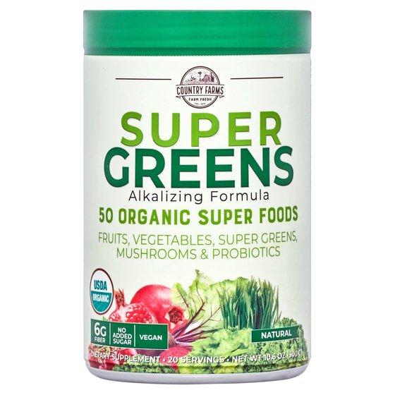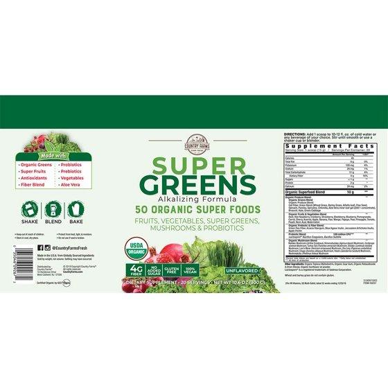 - – Country Farms Super Greens ingredients are certified as USDA Organic, meaning its fruit and vegetable ingredients are pure and natural. This drink mix is also non-GMO, vegan and gluten free.