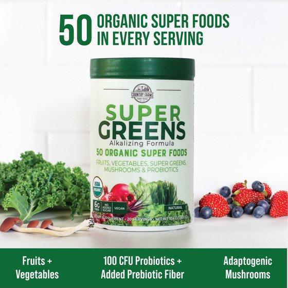 - – With Country Farms Super Greens, you will get 20 servings in a 10.6-ounce bottle, packed with 50 USDA Organic superfoods, probiotics, prebiotics, greens and grasses, plus 4 grams of fiber per serving!