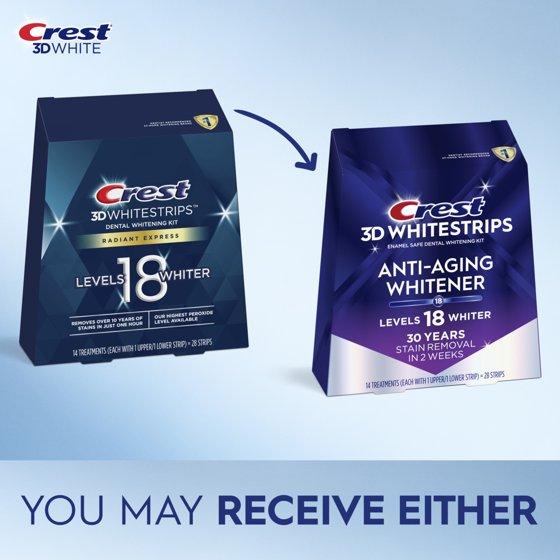 Achieve a brighter, younger-looking smile with Crest 3DWhitestrips Anti-Aging Teeth Whitening Kit, the ultimate at-home solution for professional-level whitening results without leaving your home. This advanced whitening system is specially designed to remove up to 30 years of tough stains caused by coffee, wine, and smoking in just 14 days, helping you achieve noticeably white teeth and a more youthful, radiant smile. Unlike messy gels or trays, Crest 3DWhitestrips offer a simple, convenient way to whiten your teeth at home. Each whitening strip uses Advanced Seal Technology, ensuring a secure, no-slip fit so you can talk and even drink water while whitening. This innovative design means the strips stay comfortably in place, allowing you to go about your day without interruption. The enamel-safe formula is clinically proven to deliver gentle yet effective whitening, giving you confidence with every treatment. This teeth whitening kit includes 28 whitening strips—14 for upper teeth and 14 for lower teeth—providing 14 full treatments for a complete whitening experience. For best results, apply once daily for 60 minutes. In just two weeks, you’ll see a visibly brighter smile that lasts, giving you the confidence to shine in any setting. Whether you’re preparing for a wedding, a big event, or simply want to refresh your look, Crest 3DWhitestrips make it easy to achieve your goals. Crest is the top dentist-recommended brand for at-home teeth whitening, trusted by millions for safe, effective results. With decades of innovation and proven performance, Crest continues to lead the way in whitening technology. This kit is designed for convenience, effectiveness, and safety, making it the perfect choice for anyone looking to enhance their smile without expensive dental visits. The enamel-safe formula works beneath the surface to lift deep stains while protecting your teeth, so you can whiten confidently. Plus, the Advanced Seal Technology ensures the strips stay in place, so you can multitask while whitening—no slipping, no mess, just results you can count on. Each treatment is easy to apply and fits seamlessly into your daily routine. Not intended for children under age 3. Upgrade your oral care routine today and enjoy the confidence of a radiant, youthful smile with Crest—the trusted leader in whitening innovation. Experience the difference of professional-level whitening at home and reveal the smile you’ve always wanted.